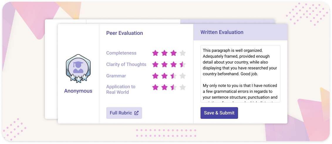 Now, students are assigned 3-5 assignments anonymously for which they give detailed qualitative and quantitative evaluations.